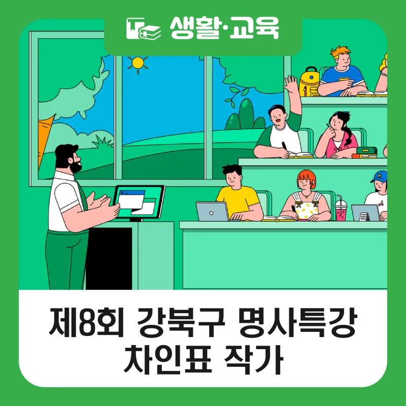 본문내용 바로가기 . 강북구청 통합예약 통합검색 무엇을 도와 드릴 까요 ? 민원챗봇 . . 수시접수프로그램 홈 > 구정참여/공모 > 수시접수프로그램 접수대기 특강 (테스트용)제8회 강북구 명사특강 대상 강북구민 등 540명 행사일 2025.11.14~2025.11.14 장소 강북문화예술회관 강북소나무홀 접수기간 2025.10.15~2025.11.07 모집인원 540 명 ( 대기 : 120명) 신청인원 0 명 신청방법 온라인 접수 / 선착순 문의 상세정보 테스트용 목록 콘텐츠 만족도 이 페이지에서 제공하는...