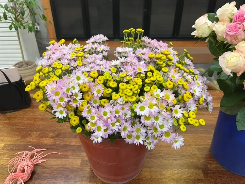 다음으로는 국화와 천일홍을 꽂아주는데요