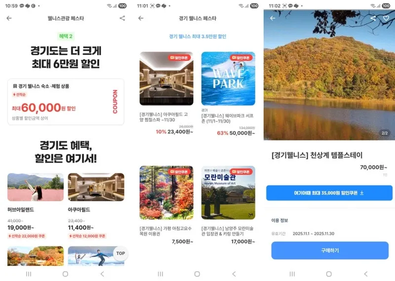 여기어때 ⇒ 이벤트 ⇒ 웰니스 페스타(이미지) ⇒ 혜택 2 경기도는 더 크게 최대 6만 원 할인 |
