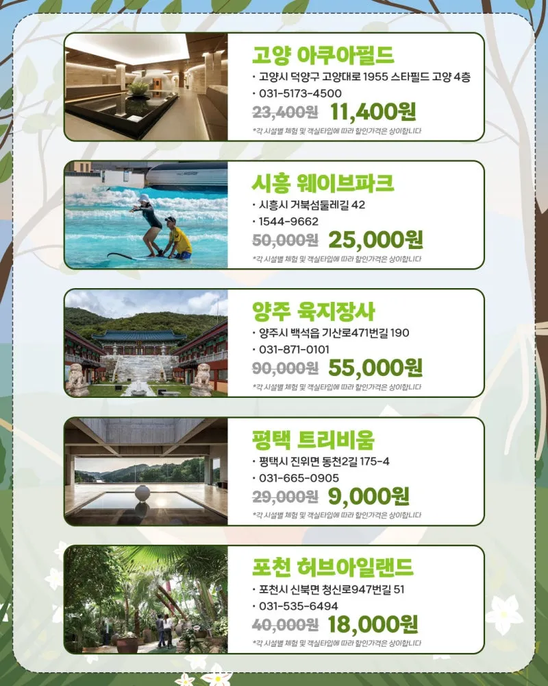 ▪ 남양주 모란미술관(키링 만들기 체험) ▪ 양평 미리내힐빙클럽(카라반 숙박) ▪ 양평 블룸비스타(호텔 숙박) ▪ 가평 아침고요수목원(입장권) ▪ 고양 아쿠아필드(찜질스파) ▪ 시흥 웨이브파크(서핑 레슨) ▪ 양주 육지장사(我 아-차 선명상 템플스테이) ▪ 평택 트리비움(아트스페이스 체험) ▪ 포천 허브아일랜드(핑크뮬리 축제 힐링 코스) |