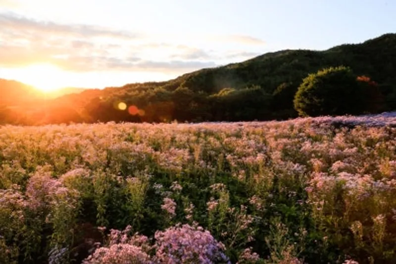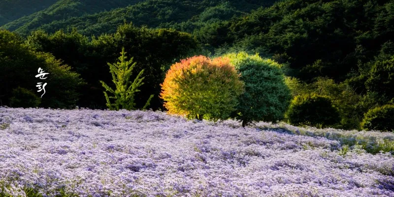 특히 일몰 무렵 햇빛이 개미취 꽃밭에 물들면