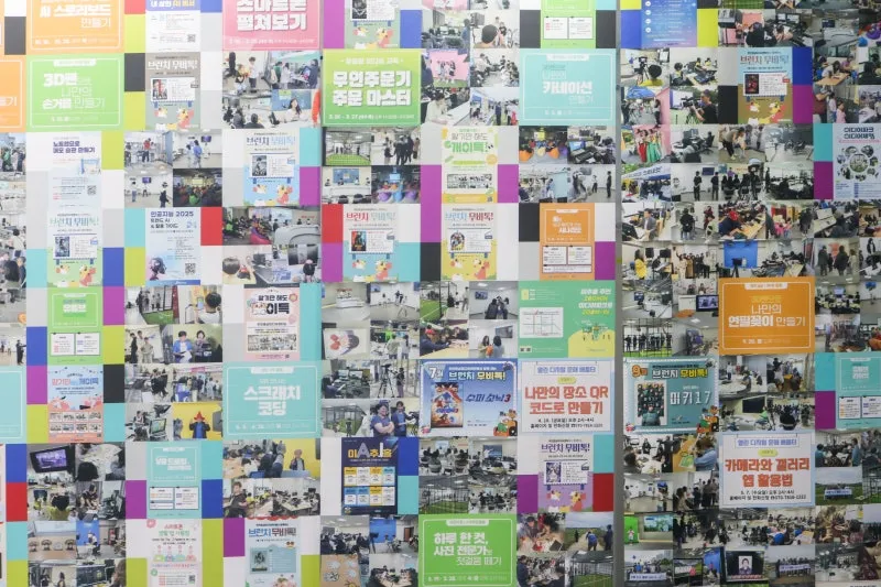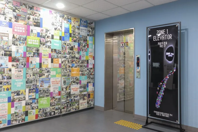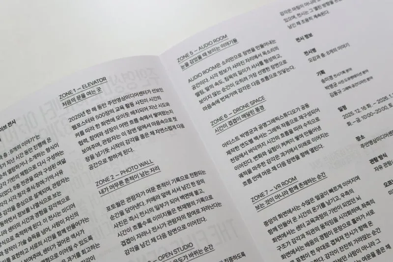 ZONE1은 엘리베이터 앞 복도로 2025년 한 해 동안 주안영상미디어센터가 선보인 교육 활동 사진들이 전시되어 있으며,