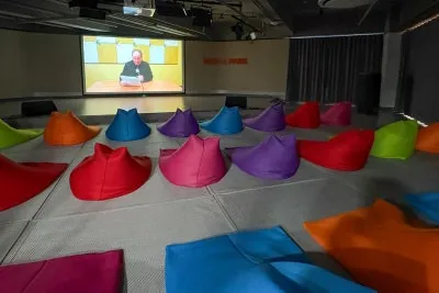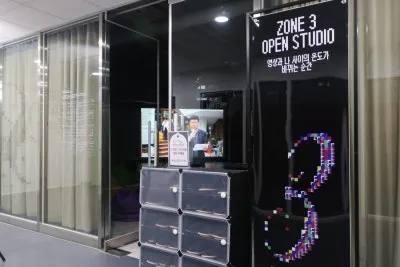 ZONE3 오픈스튜디오는 빈백에 앉아 단편영화부터 마을 리포터들이 만든 미추홀구 소식까지 편안히 관람할 수 있었습니다. 마찬가지로 바로 옆 ZONE4는 카페 공간으로, 관람하면서 잠시 쉬어가거나 짐을 보관할 수 있는 라운지로 마련되어 있습니다.