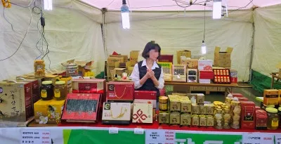 이곳 축제장에서는 인삼뿐만 아니라 인삼을 가공해 만든 식품들도 만날 수 있는데요, 홍삼, 액기스 홍삼절편, 홍삼천마차, 홍삼사탕, 홍삼캔디, 소배산 꿀 등 다양합니다.