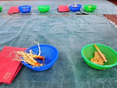 선착순 20명 접수인데요, 잔뿌리는 때고 대나무 칼과 삼배 수건으로 자신만의 방식으로 예쁘게 껍질을 제거하시면 점수를 매겨 선물을 받을 수 있고, 순위에 못 들어도 자신이 깎은 인삼 3뿌리와 홍삼사탕을 선물로 받을 수 있어서 축제의 추억을 담아갈 수 있는 체험입니다.