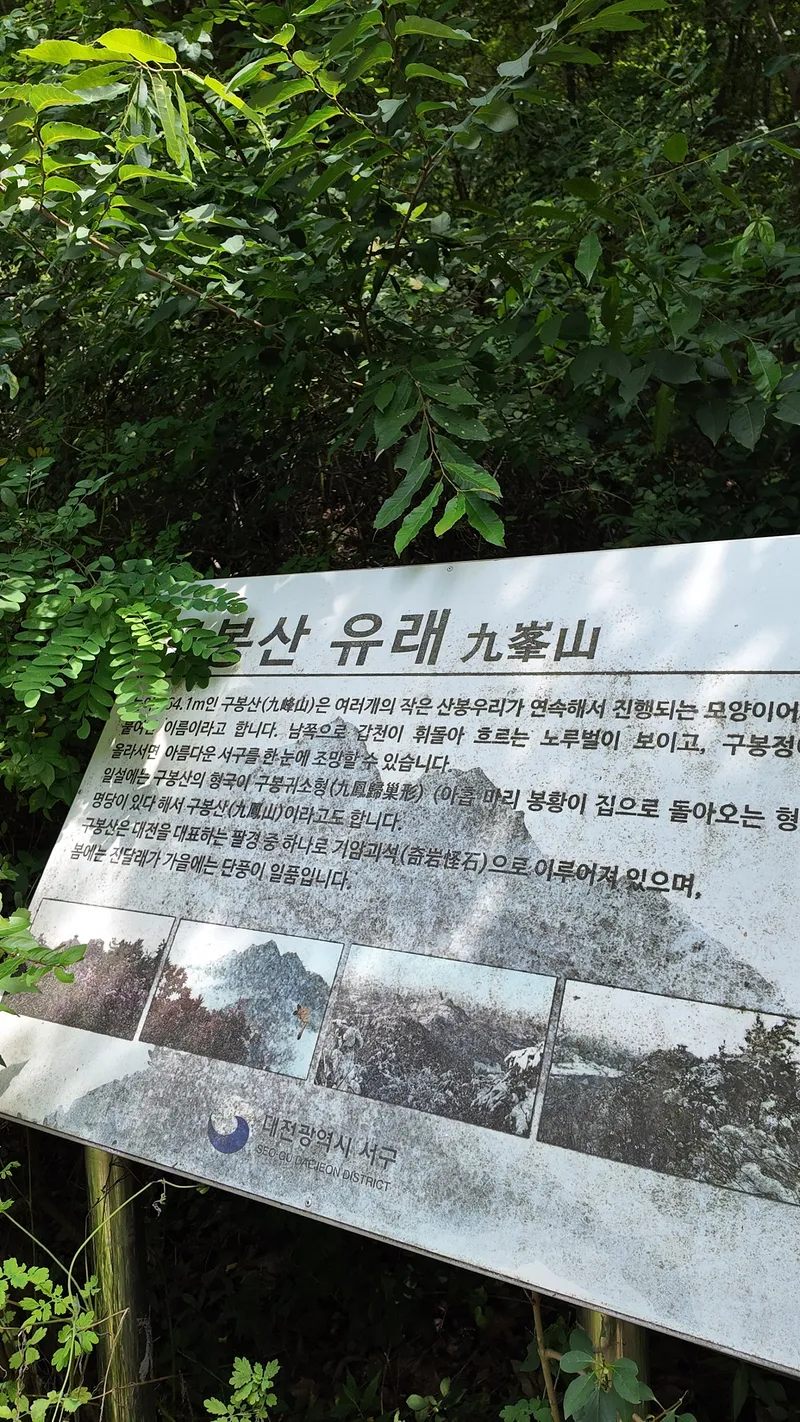 정상에는 구봉정이라는 정자가 자리하고 있으며, 대전 서구 전역과 남쪽으로 흐르는 갑천, 노루벌 일대가 한눈에 내려다보입니다.