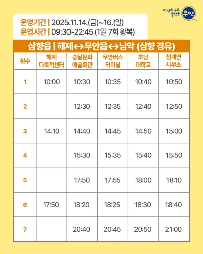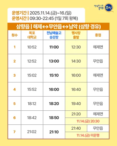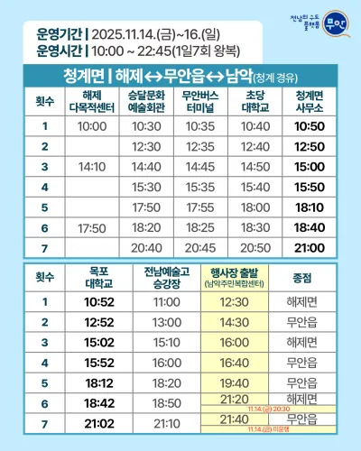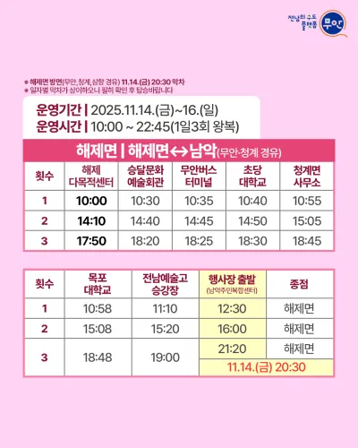 ※ 해제면 방면(무안,청계,삼향 경유) 11.14.(금) 20:30 막차