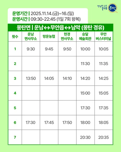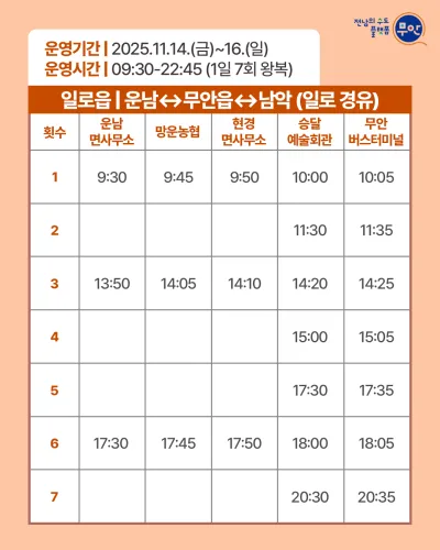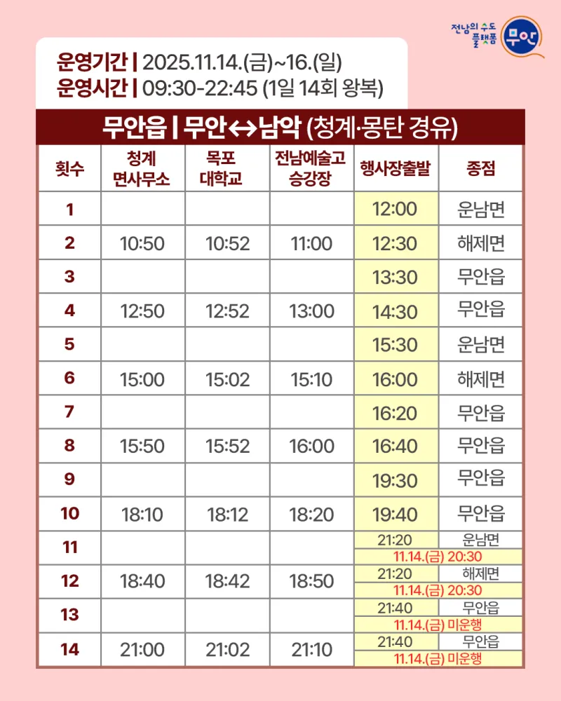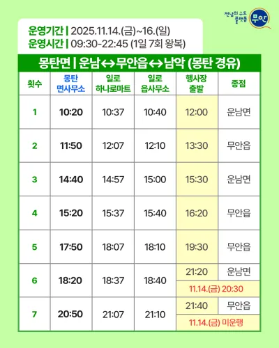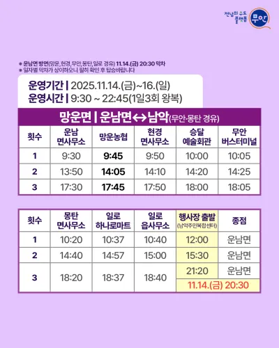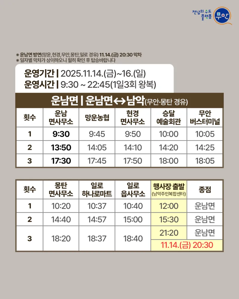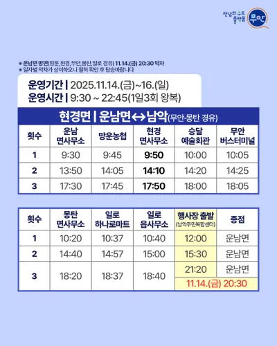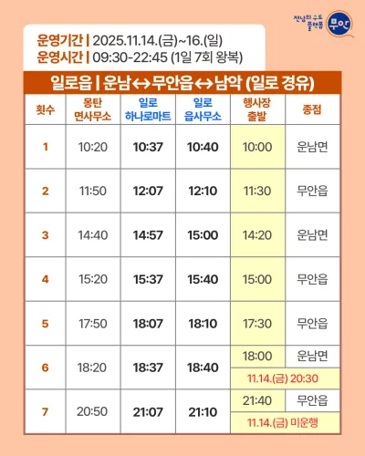 ※ 운남면 방면(무안,몽탄,일로 경유) 11.14.(금) 20:30 막차