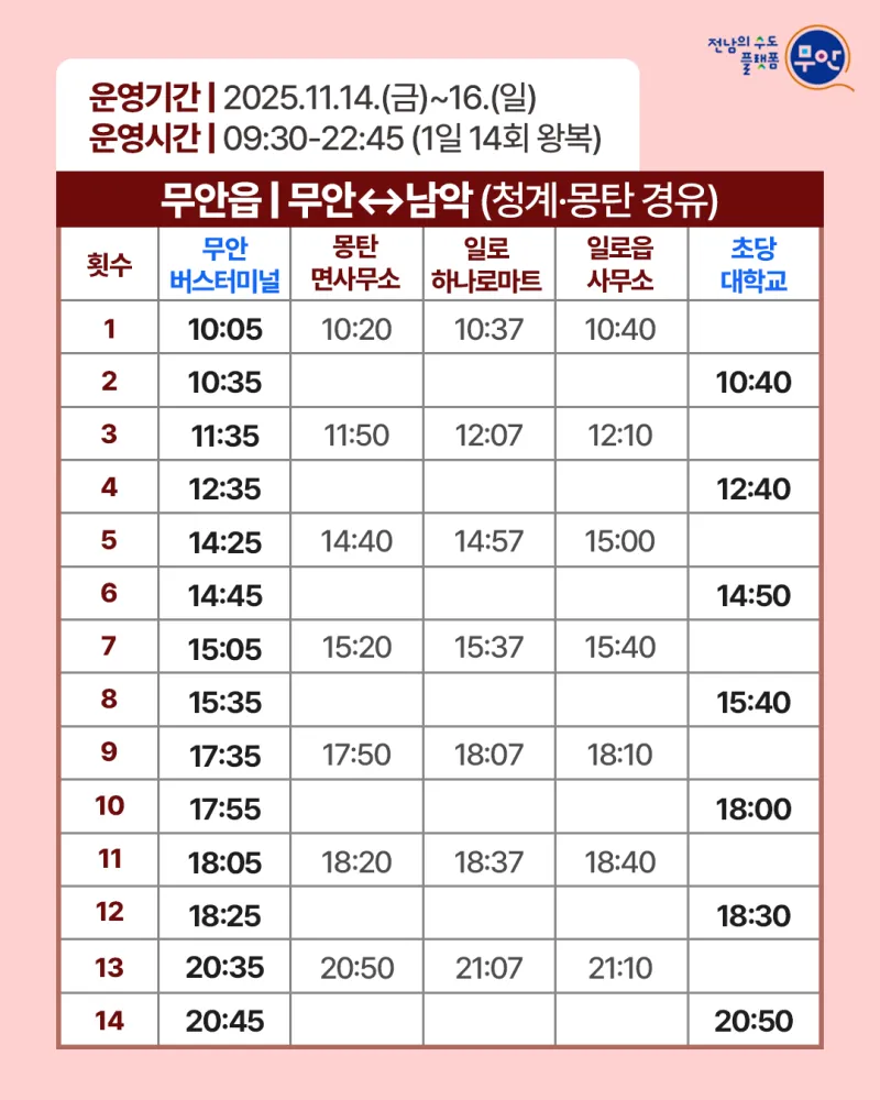 ※ 무안읍 방면(몽탄,일로 경유) 11.14.(금) 20:30 막차