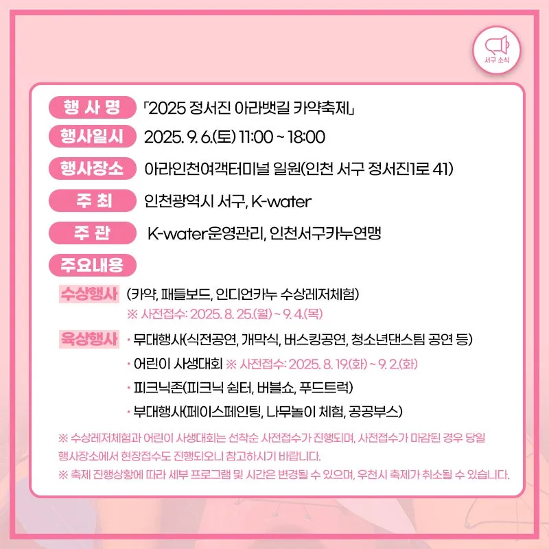 안녕하십니까. 2025 정서진 아라뱃길 카약축제 「어린이 사생대회」 사전 참가자를 모집하고 있습니다. 많은 관심과 참여 부탁드립니다. (사전참가신청 2025. 8. 19(화) ~ 9. 2(화) 18시까지) 1. 행 사 명 : 2025 정서진 아라뱃길 카약축제 「어린이 사생대회」 2. 행사일시 : 2025년 9월 6일(토) 11:30~18:00 3. 행사장소 : 아라인천여객터미널 일원 (인천 서구 정서진1로 41) 4. 행사일정 *세부 일정은 상황에 따라 변동될 수 있습니다. (11:30~14:00) 참가자 등록 및 도화지 배부 / ...