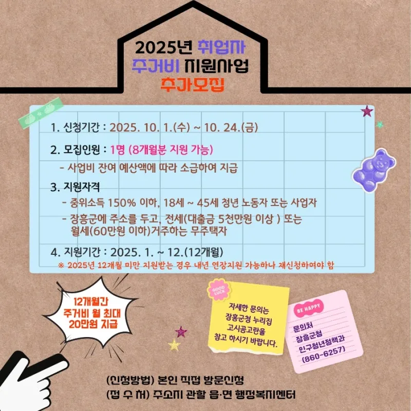 장흥군에서 청년 노동자와 사업자를 위한 주거비 지원사업을 추가 모집합니다! 🙌