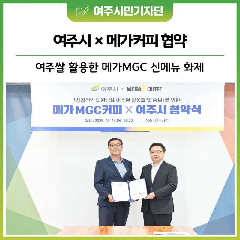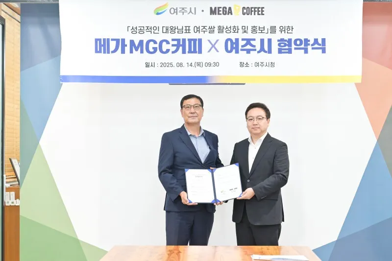 지난 8월 14일 여주시청에서 열린 협약식에는 이용철 여주시 경제환경국장, 신방섭 메가MGC커피 부사장, 여주시 가맹점주 등이 참석해 ▲여주쌀 활용 신메뉴 개발·출시 ▲인지도 제고 및 소비 확대 ▲전국 3,800여 매장 및 온라인 홍보 협력을 약속했다.