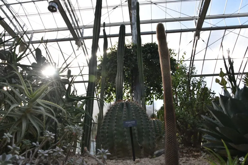 선인장 온실에 들어서면 가장 먼저 반겨주는 웅장한 무륜주 선인장이 눈길을 사로잡습니다. 높이 2.7m에 달하는 이 무륜주는 마치 작은 나무처럼 기품 있게 서 있어 온실에 이국적인 분위기를 더해 줍니다.