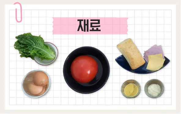 토마토 1개, 상추 2장, 치아바타 1개, 달걀 2개, 체다 슬라이스 치즈 2장,