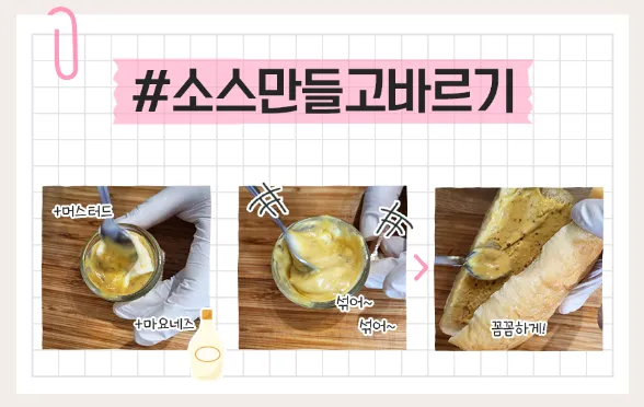 4. 홀그레인 머스터드와 마요네즈를 잘 섞어, 치아바타 안쪽에 소스를 골고루 바릅니다!
