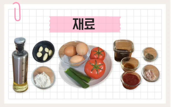 토마토 2개, 달걀 3개, 대파, 마늘, 전분가루 1T, 새우젓 0.5T, 굴 소스 0.5T, 케첩 1T, 참기름, 후추, 올리브유