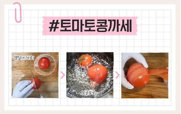 토마토 아래에 십자(十) 칼집을 낸 뒤, 살짝 데치면 껍질이 잘 벗겨져요!
