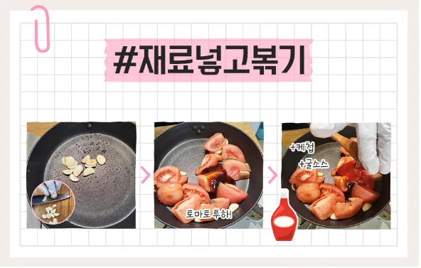 8. 잘라 놓은 토마토와 굴 소스, 케첩을 넣어 볶아주세요!