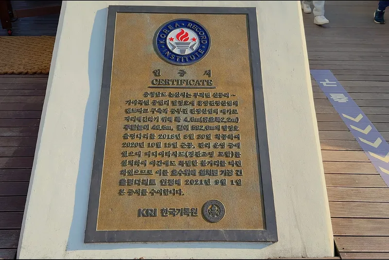 탑정호 출렁다리 앞쪽에는 KRI 한국기록원으로부터 받은 인증서를 볼 수 있습니다. 이 인증서는 탑정호 출렁다리가 '호수 위에 설치된 가장 긴 출렁다리'로 공식 인정받았음을 증명하는 증서입니다.