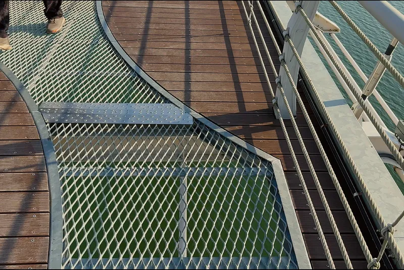 탑정호 출렁다리의 바닥은 나무 데크와 철망으로 구성되어 있습니다.