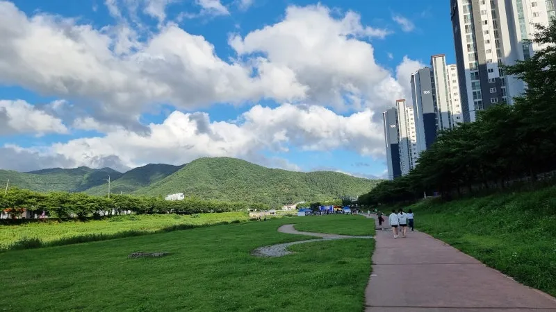 장마로 인해 아침까지 소나기가 오고 어두컴컴했던 광려천 하늘이 오후가 되자 거짓말처럼 맑아졌습니다. 아마 하늘도 제1회 청소년 축제인 온니 축제를 도와주고자 하는가 봅니다.