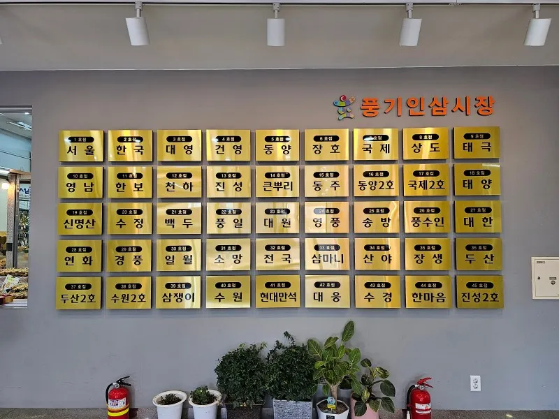 인삼시장에 가면 왠지 건강해지는 기분이 들더라고요. 인삼의 고장 영주에서 인삼을 직접 보고 구입이 가능한 곳이라 제품에 대한 믿음도 크고요. 벽면에는 풍기인삼시장 내에서 운영되고 있는 점포 이름을 찾아볼 수 있어요.