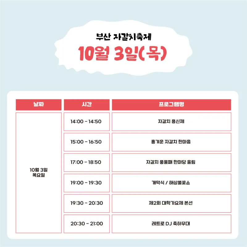 ▷개막식 : 10.3.(목) - 자갈치용신제, 개막식, 해상불꽃쇼, 대학가요제 본선, DJ축하 무대