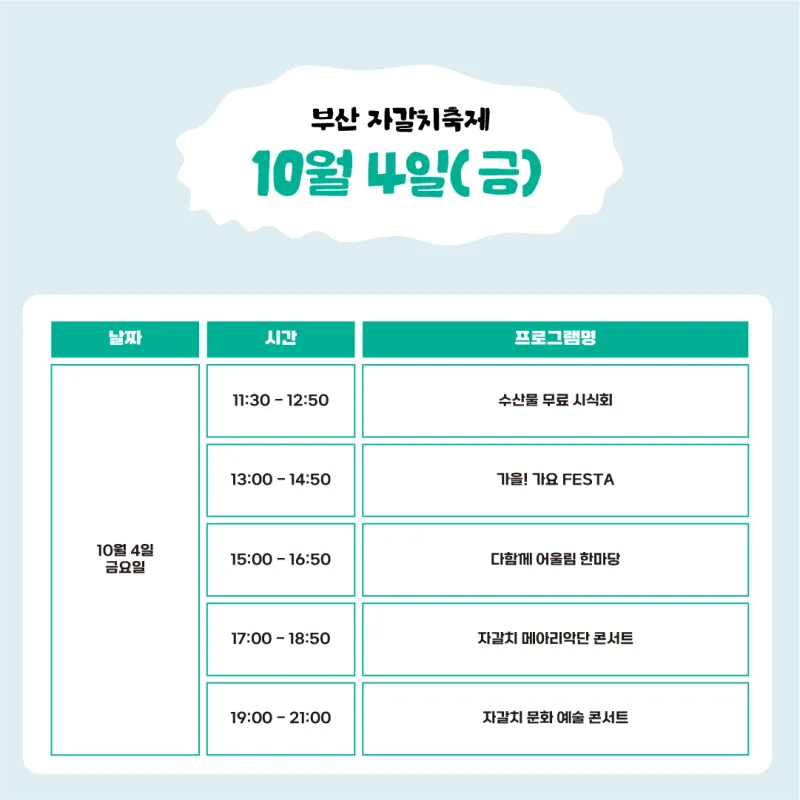 ▷주요 포인뜨! : 개막식, 대학가요제, 수산물 무료 시식회(10.4. / 10.6. 11:30~12:50)