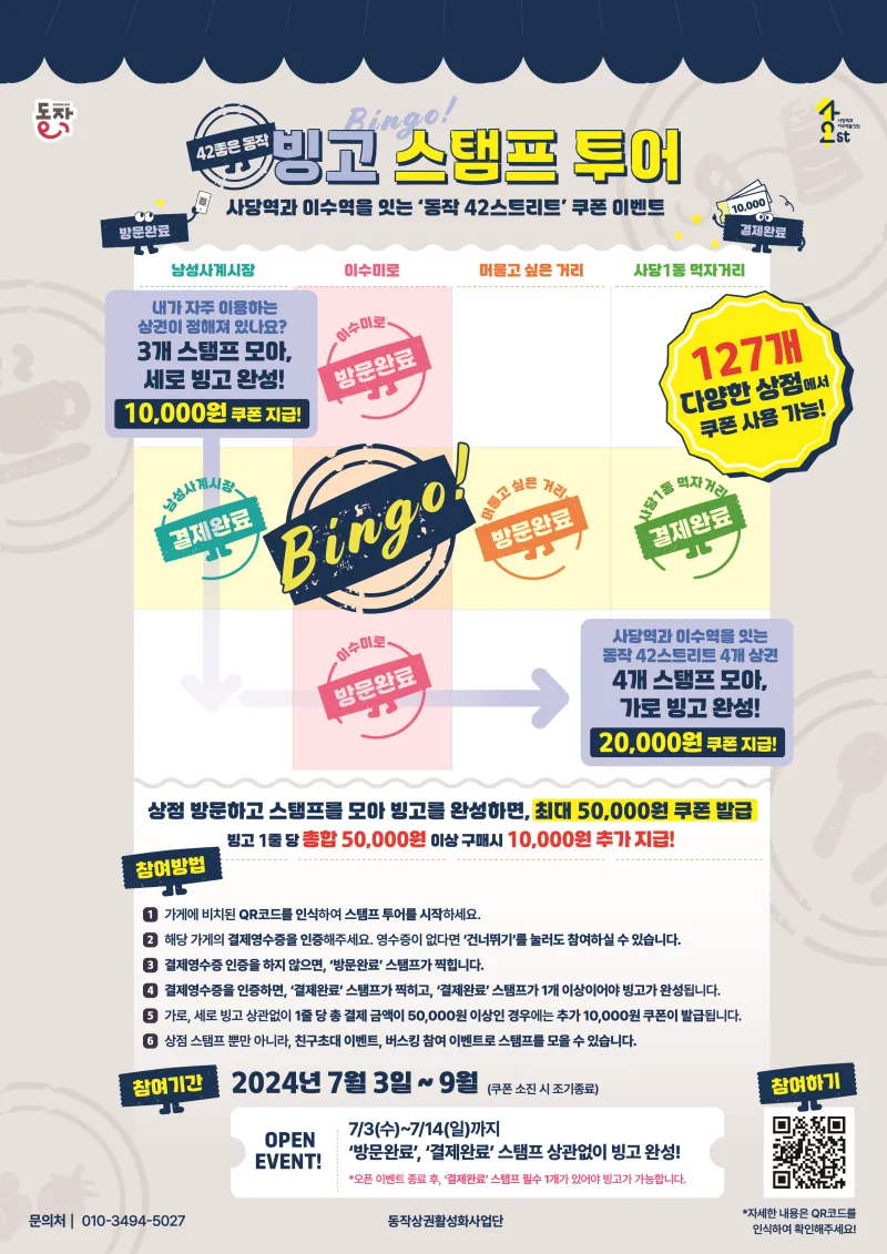이번 이벤트는 동작구의 동작 42스트리트(남성사계시장, 이수미로, 머물고싶은거리, 사당1동 먹자거리)에서 쓸 수 있는