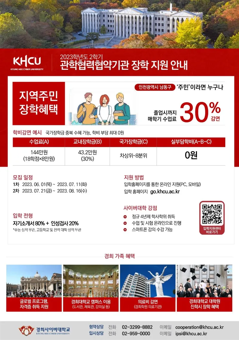 산업체 및 군위탁 전형 혜택 전형료 면제, 수업료 50% 감면 협약기관: 삼성전자, 쿠팡, 이마트, 농협, 공무원 등 약 800개 기관 교육부가 인증한 최우수 사이버대 교육부 평가, 3회 연속 최우수 사이버대학 선정 2007년, 2013년, 2020년 경희의 온라인 캠퍼스 지금, 여기, 경희사이버대학교 2023학년도 새로워진 학과 미래인간과학부, 중국어문화학과, 호텔경영학과, 외식조리경영학부 경사인만이 누리는 경희 동문 혜택 경희대 캠퍼스 이용 경희 의료기관 의료비 감면 등 산업체 및 군위탁 전형 혜택 전형료 면제, 수업료 50%...