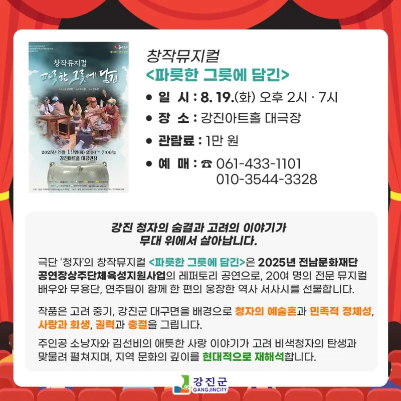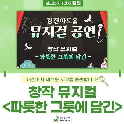 {"title":"🎭 강진아트홀 창작 뮤지컬 <파릇한 그릇에 담긴>","source":"https://blog.naver.com/gangjingun/223970269880","blogName":"☆반값 여..","domainIdOrBlogId":"gangjingun","nicknameOrBlogId":"강진군","logNo":223970269880,"smartEditorVersion":4,"meDisplay":true,"lineDisplay":true,"outsideDisplay":true,"cafeDisplay":true,"blogDisplay":true}