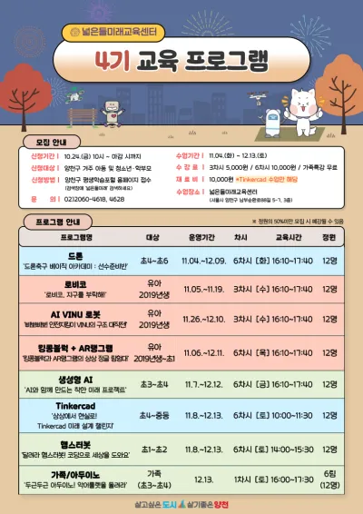 넓은들미래 총 77 건 (1/8 페이지) 보기 강좌목록 번호 교육기관 강좌명 교육기간 (교육시간) 접수기간 접수인원(신청/정원/대기) 수강료 접수상태 접수방법 77 넓은들미래교육센터 4차산업 미래교육 [넓은들_4기 프로그램]-{화} 드론 ‘드론축구 베이직 아카데미 선수 준비반’ (초4~초6) 25.11.04 ~ 25.12.09 [화] 16:10 ~ 17:40 일반 25.10.24 ~ 25.10.30 0/12명 대기자 0명 유료 접수예정 온라인 76 넓은들미래교육센터 4차산업 미래교육 [넓은들_4기 프로그램]-{수} 로비코 ‘로비코,...