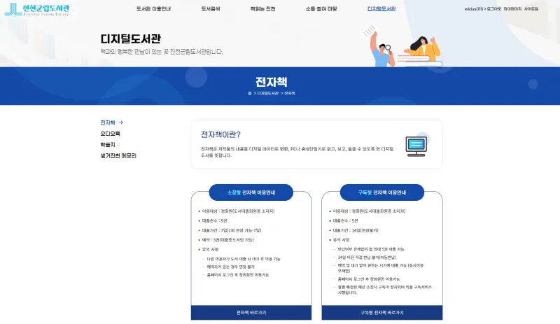 진천군립 도서관의 전자책은 소장형/구독형 두 가지 방법으로 이용할 수 있는데, 우선 두 가지를 모두 이용하기 위해서는 일반 도서 대출과 마찬가지로 도서대출증 회원증을 먼저 발급받고 홈페이지 가입 회원이어야 합니다.