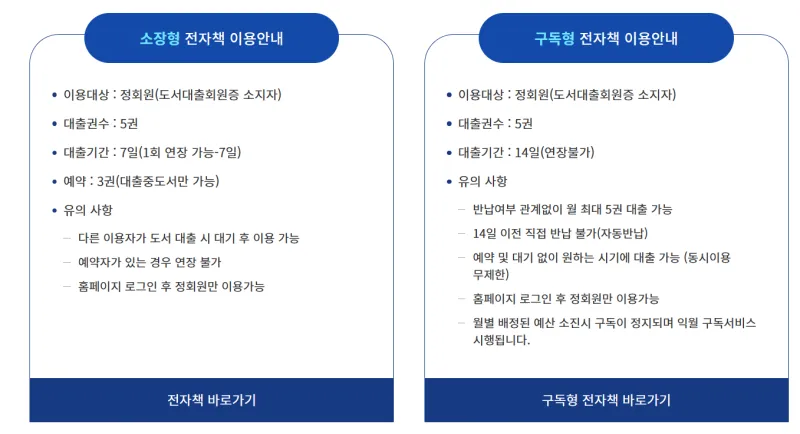소장형과 구독형은 약간의 차이가 있는데요. 소장형은 이미 대출된 도서가 반납될 때까지 대기한 후 사용할 수 있으며, 7일 동안 대출할 수 있습니다. 구독형은 대출 여부에 상관없이 14일까지 원하는 책을 전자도서관 앱에 담아 읽을 수 있습니다.