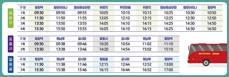 위양지, 표충사, 얼음골 코스 구간 별 시간표