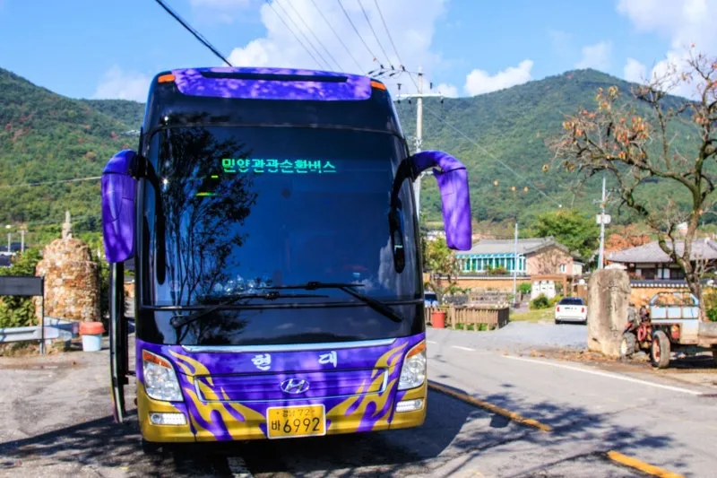 여행 당일 위양지 코스로 정하고 첫차를 타보자 하고 자족과 함께 9시 30분 첫 차를 타려고 밀양역에 도착하니 보라색 45인승이 기다리고 있었는데요. 보통은 25인승 버스로 운행된다고 합니다.