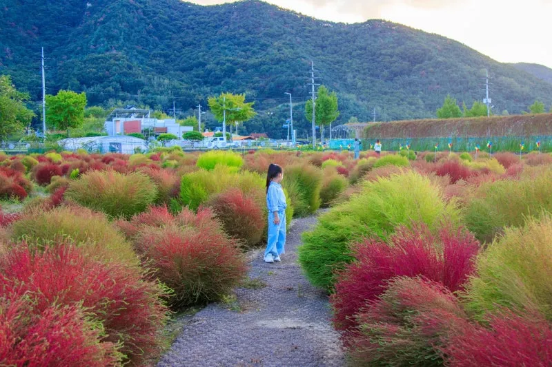 밀양 아리나 연극촌 바로 옆에는 주변 산책 코스로 연꽃 단지가 있는데요. 지금 댑싸리가 만개하여 데이트나 가족 나들이 가기 좋은 산책 환경이 조성되어 있답니다.
