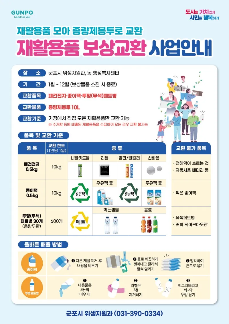 아무리 줄이려고 해도 자꾸 늘어나기만 하는 재활용품, 그동안 분리하기 힘드셨죠. 군포시에서는 재활용품을 가져오시면 종량제봉투로 교환해 드리는 재활용품 보상교환 사업을 연중 실시합니다! 다 쓴 폐건전지와 우유 등을 마시고 잘 씻어서 모아두었던 종이팩, 생수를 마시고 생긴 투명 페트병까지! 가정에서 직접 깨끗하게 세척하고 기준에 맞게 모아오시면 종량제봉투로 바꿔드리니, 이제 환경도 지키고 종량제봉투 값도 아껴보세요~(˶•⩊•˶)
