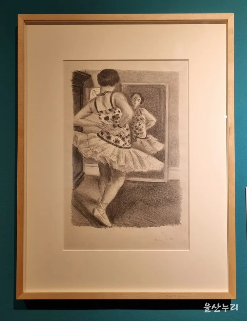 거울에 비친 댄서. 판화임에도 불구하고 주인공의 거울 속 모습과 생동감, 섬세한 그림자와 질감에 시선을 머물게 했습니다.