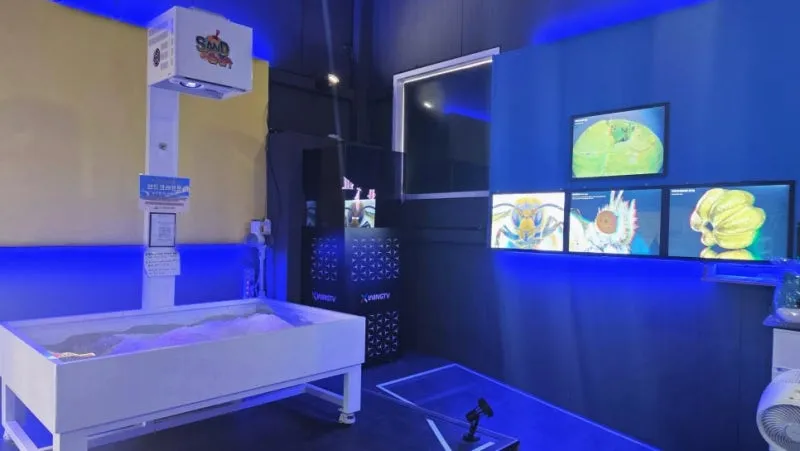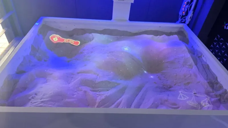 이곳은 모래 위에 빛을 비춰 다양한 지형을 만드는 체험 공간이에요.