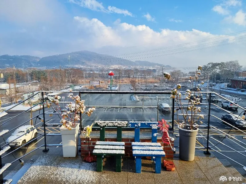 로컬푸드 직매장 2층은 카페 '아늑'입니다. 탑정호를 내려다보며 여유로운 시간을 보냈는데요. 눈이 내리고 나니 설경이 더욱 눈이 부시네요.