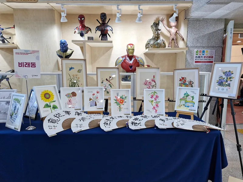비래동주민자치회에서는 전통부채에 글씨를 써 장식한 작품을 전시했습니다. 전시된 다른 그림들도 초보자가 아닌 전문가다운 솜씨를 선보였습니다.