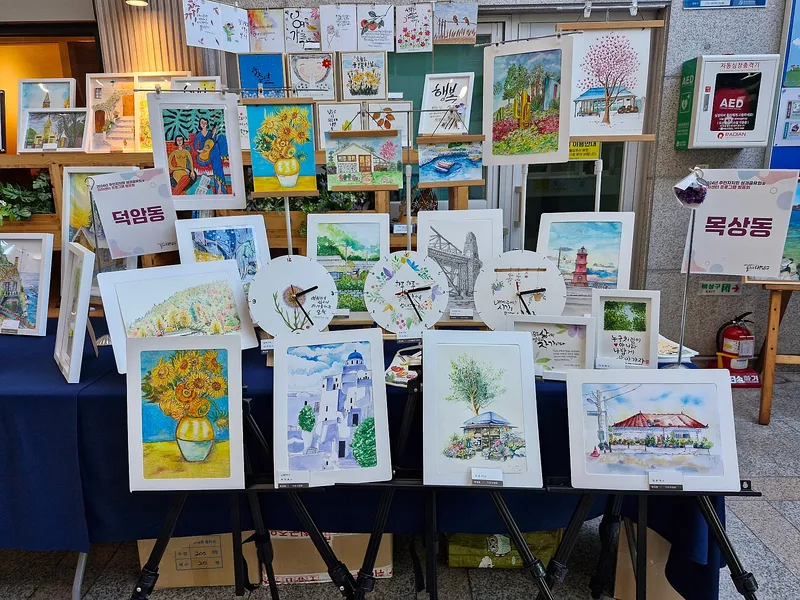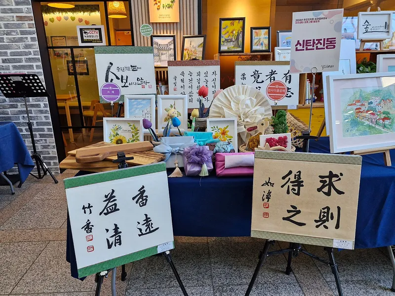 목상동은 다양한 기법을 사용한 작품과 벽시계에 아름다운 글귀가 캘리그라피로 쓰여 있는 작품을 전시했습니다. 이 작품을 전시하기 위하여 많은 시간과 노력을 했음을 짐작할 수 있었습니다.