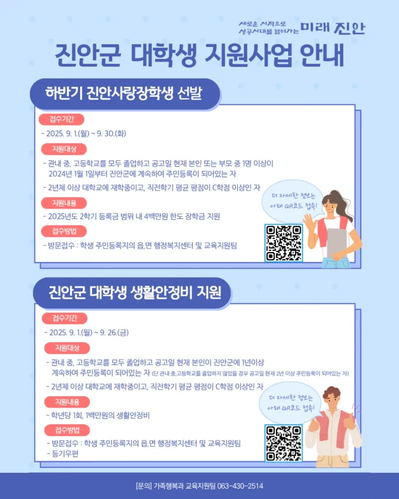 👥 대상: 관내 중·고등학교 모두 졸업 & 진안 거주, 2년제 이상 대학 재학생(C학점 이상)