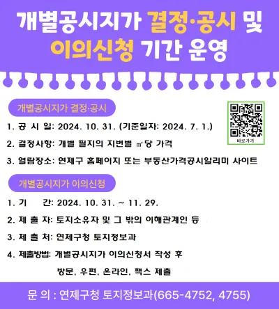 개별공시지가 결정·공시 및 이의신청 안내 연제구 토지정보과 ☎051-665-4752, 4755 |