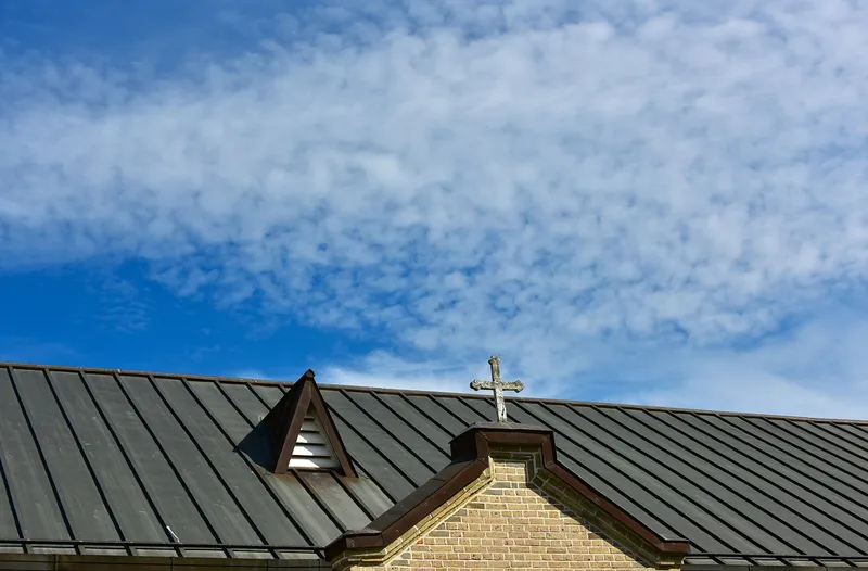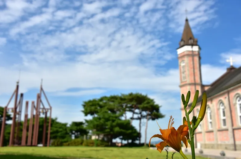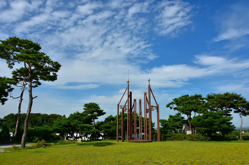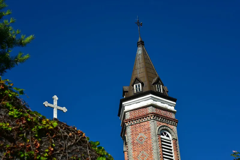 구름이 뭉게뭉게 바람 따라 흐르고 있어 구름의 자유로운 유영이 아름다운 그림이 됩니다. 12개의 종으로 만들어진 종탑이 있어 미사 시간과 삼종 기도를 알리고 있습니다.