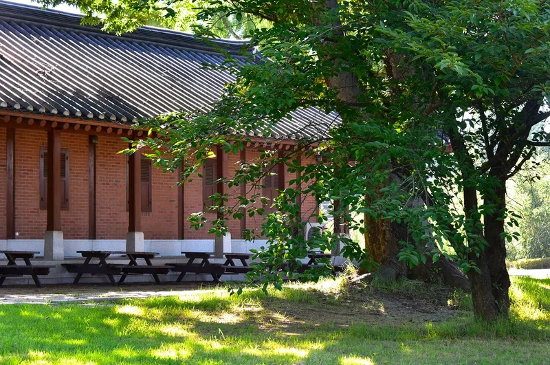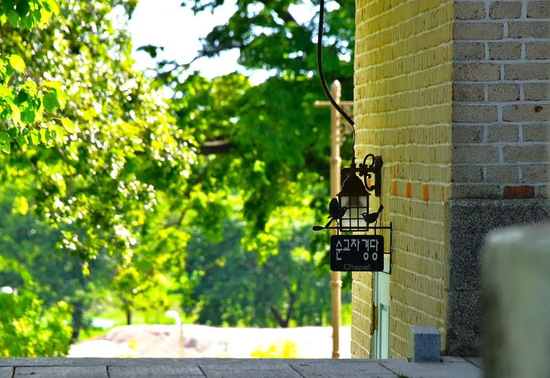붉은 벽돌의 외벽이 아름다운 성당 건축을 감상하며 뒤뜰로 이동하면 시원한 나무 그늘 아래 나무 의자가 놓여 있어 쉼하기 좋은 곳입니다. 성당을 바라보며 천주교의 역사와 고딕 양식 건축의 멋스러움을 감상할 수 있고 뒤편으로는 합덕제의 아름다움을 감상할 수 있습니다.