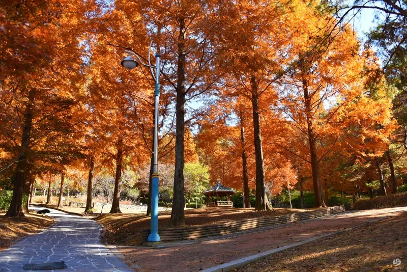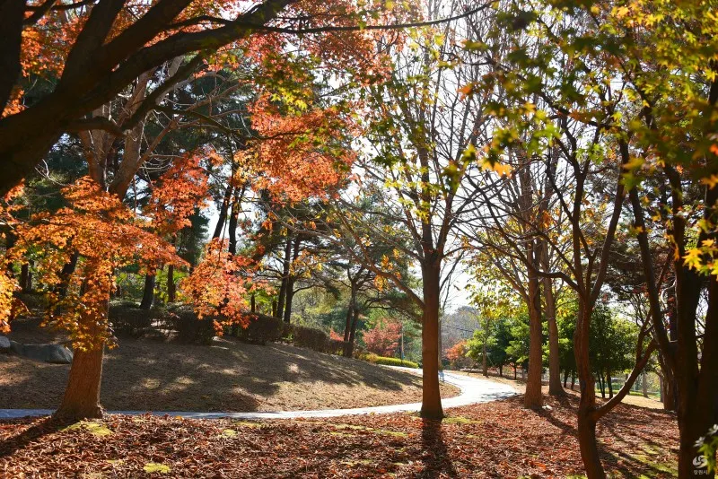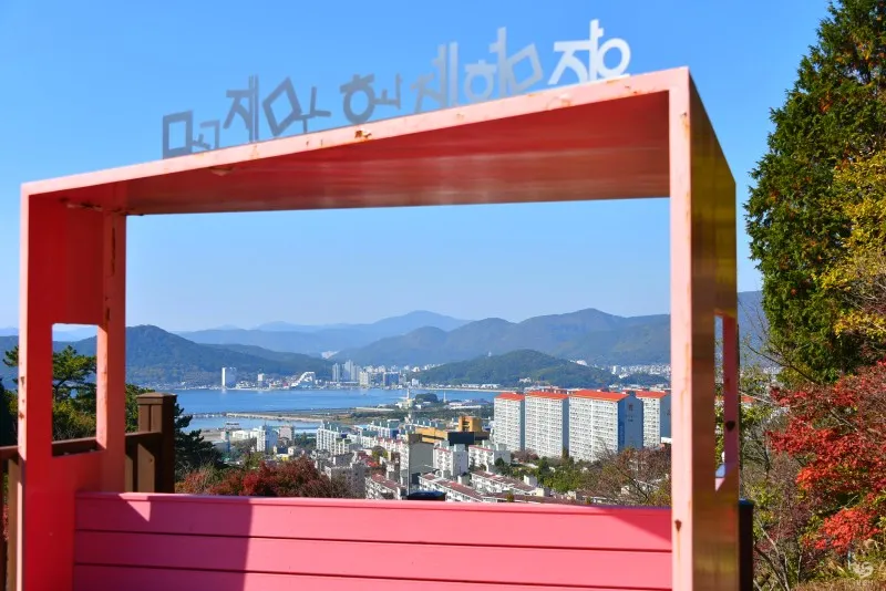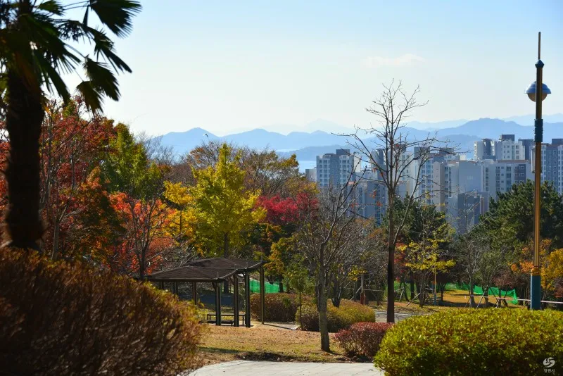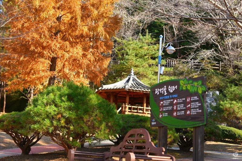 광석골 파크골프장을 지나 올라가면서 보이는 진해 바다와 한창 예쁘게 물들은 단풍나무의 풍경을 보며 휴식을 취해 봅니다. 광석골 쉼터는 휴식공간이 부족한 주민들이 자연환경의 아름다운 숲속에서 휴식을 취할 수 있도록 조성된 곳인데요. 자연계곡 속에 조성되어 사계절 흐르는 물과 단풍나무 등 25종의 다양한 수목과 잔디광장, 야외 음악 놀이터 등 가족 나들이 코스로 안성맞춤인 휴식공간입니다.