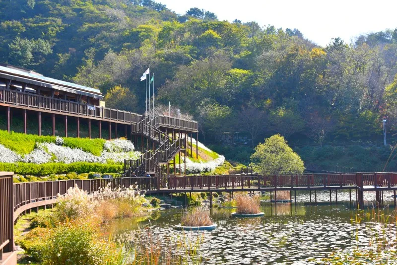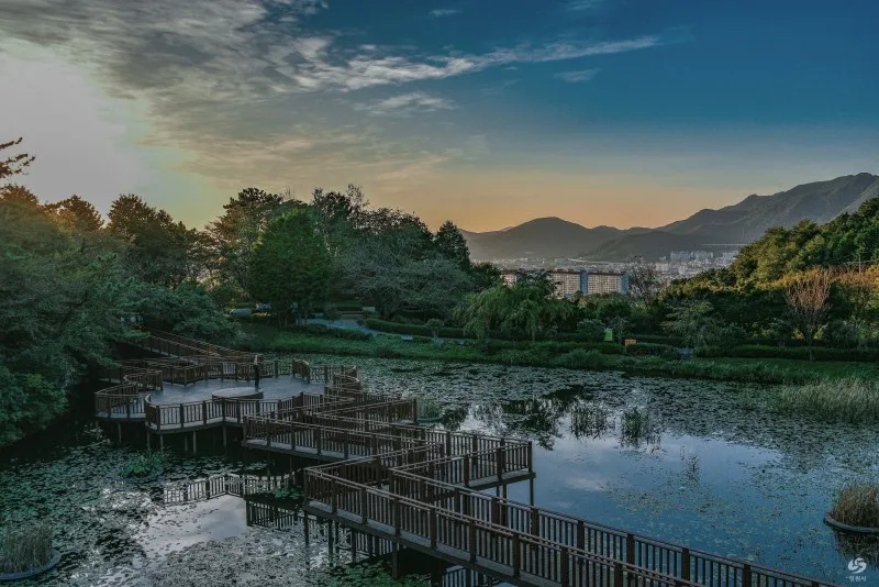 목재문화체험장 앞 연못 위로 나무테크 산책로가 있어 또 다른 산책의 재미를 느낄 수 있답니다. 이 나무데크 산책로는 ' 드림파크 행복나눔길'로 창원 특례 시 출범을 기념하여 '2022'를 형상해 조성된 모두가 즐기로 행복을 나눌 수 있는 길이란 뜻이 있습니다. 연꽃, 창포 등 수생식물과 어류 등 다양한 동. 식물을 관찰할 수 공간이기도 합니다.
