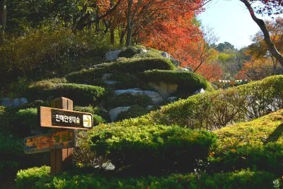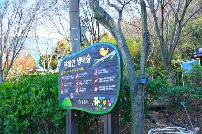 목재체험장에서 진해만 생태숲 이정표를 따라 올라갈 수 있는데요, 진해만 생태숲은 약 67ha의 대규모 난대림 생태지역으로 아름다운 숲과 진해만의 바다 경관을 볼 수 있습니다. 또한 우리나라에서 흔히 볼 수 없는 희귀식물 약 90 종을 관찰할 수 있는 식물관이 있고 생태 탐방로를 따라 11개의 테마 숲과 작은 수목원, 상징 숲 등이 조성되어 있습니다.